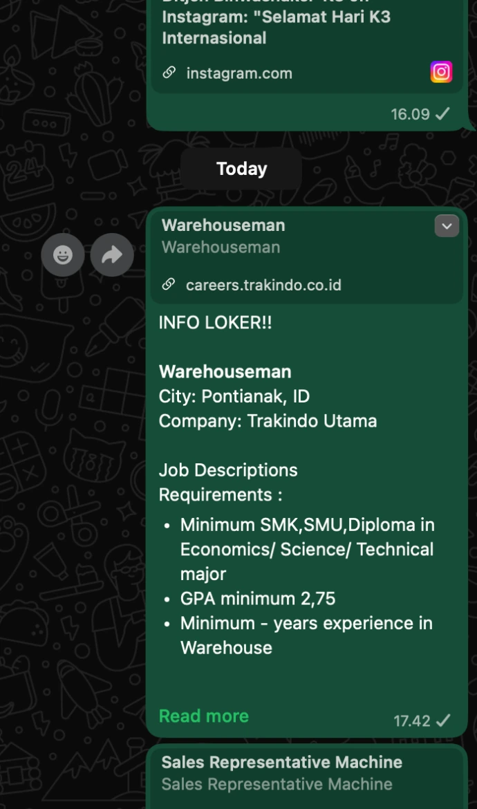 Sharing informasi lowongan kerja, peraturan terbaru, praktik baik, webinar, info pelatihan gratis, dan update keilmuan dari 600+ anggota yang terdiri dari praktisi, akademisi, dan regulator di bidang keselamatan dan kesehatan kerja se-Indonesia.